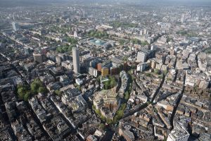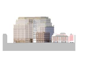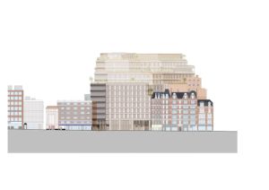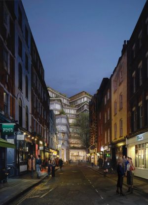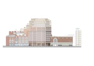 Having studied the main views to and from the existing building, its relationship to neighbouring listed structures, as well as the local character of the adjacent Soho and Seven Dials Conservation Areas, our proposal works in close dialogue with its surroundings. Where the existing building confuses the legibility of the St Giles Quarter, our design references the geometry of the nearby Cambridge Circus, functioning as a backdrop to this urban ensemble.